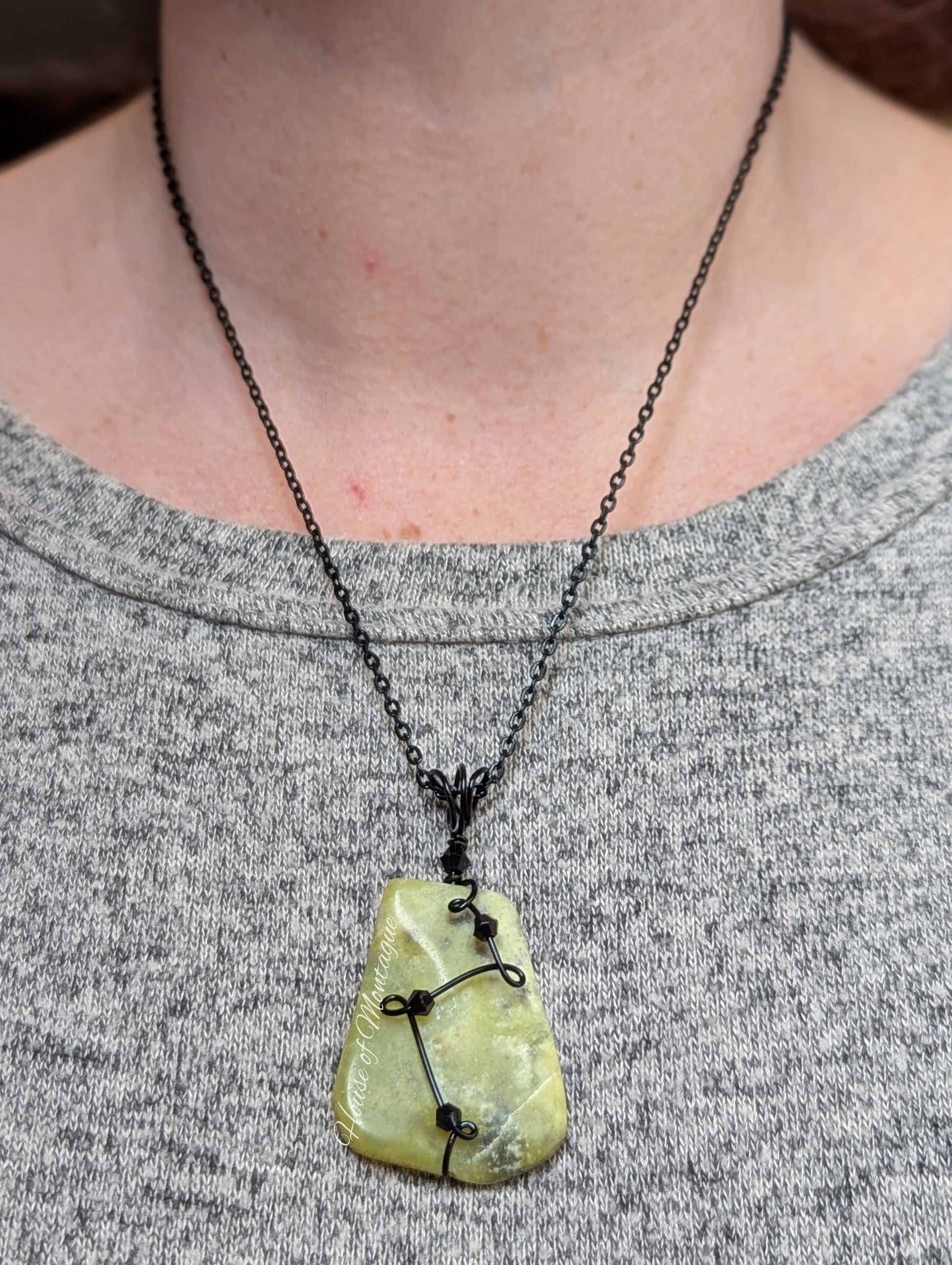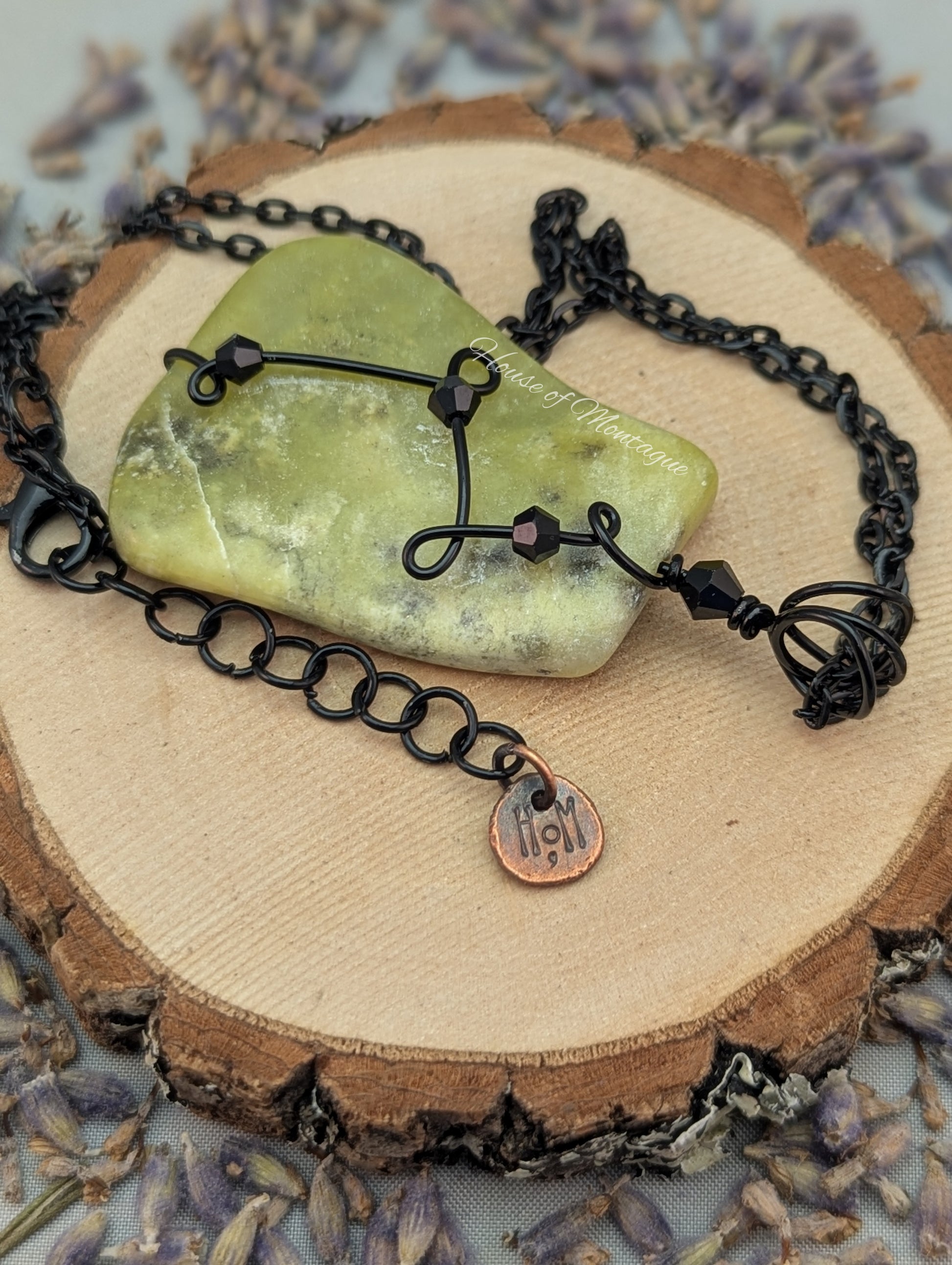 While Olive New Jade is a type of Serpentine, it actually shares properties with real Jade. It's best known for promoting emotional cleansing, healing, and balance with its tranquil energy. This one has a simple design in black enameled copper wire, accented with black beads.